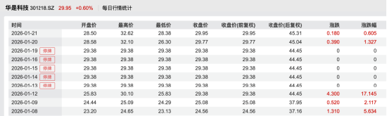 披露控制权变更及定增方案后,华是科技于1月20日复牌交易。当天开盘后股价不涨反跌,盘中震荡,尾盘才勉强翻红,最终收报29.77元/股,涨幅1.33%。相比之下,在1月12日公司盘后披露筹划控制权变更事项前,股价已提前异动,当日收涨17.15%。